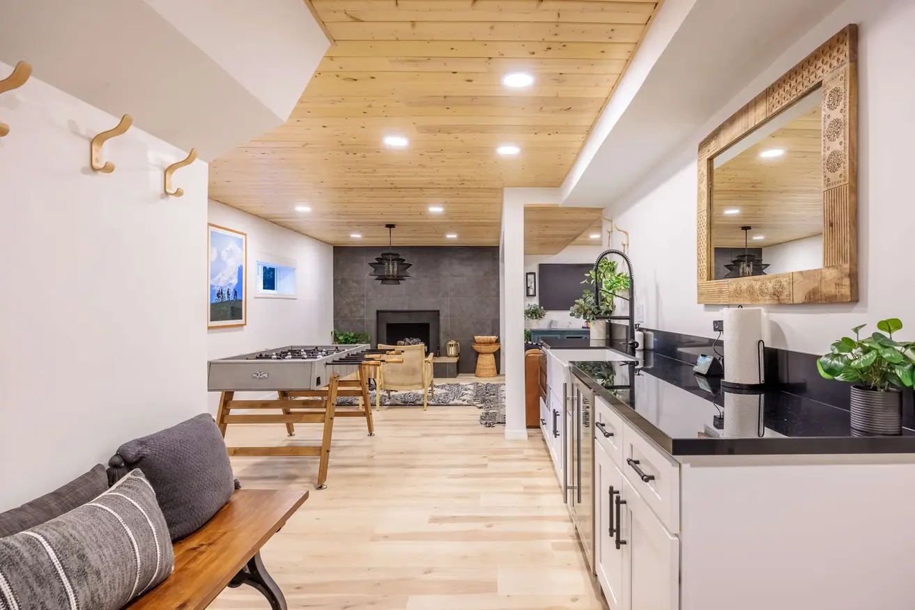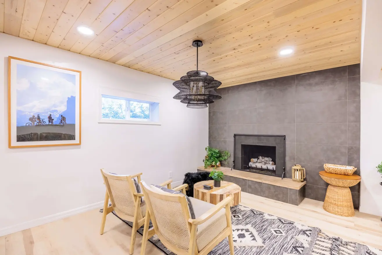 Relax in the bright and open living area, centered around a cozy gas fireplace. High ceilings, modern decor, and Sonos speakers throughout the home set the mood for everything from movie nights to game days. Large windows bring the outside in, giving you that perfect cabin-meets-luxury vibe.