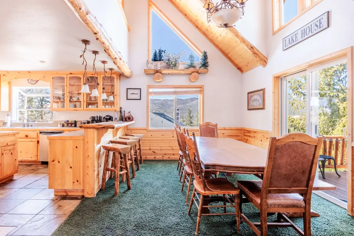 The spacious main-level living room features soaring ceilings, a wood-burning fireplace, and panoramic windows. Relax with your crew while enjoying the 60” projection TV or play games with a view of the mountains.