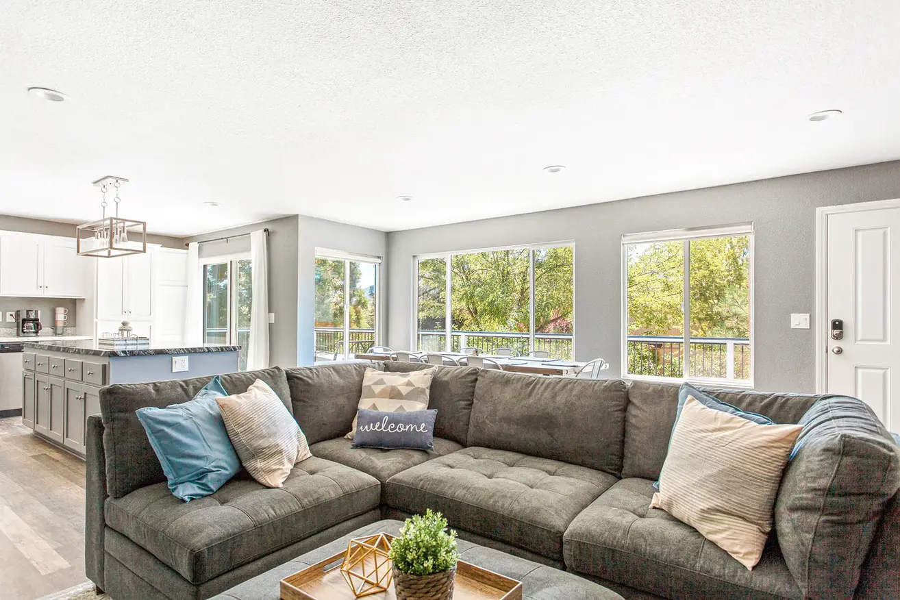 The fully equipped kitchen has all the amenities you need to cook or bake the perfect meal during your stay. We have all the appliances you’ll need, including a dishwasher, Refrigerator, Oven, Stove, Microwave, and Coffee Maker. The open floor plan makes meal times a breeze, transitioning to the large dining table, and you can even seat extra family members at the island counter.