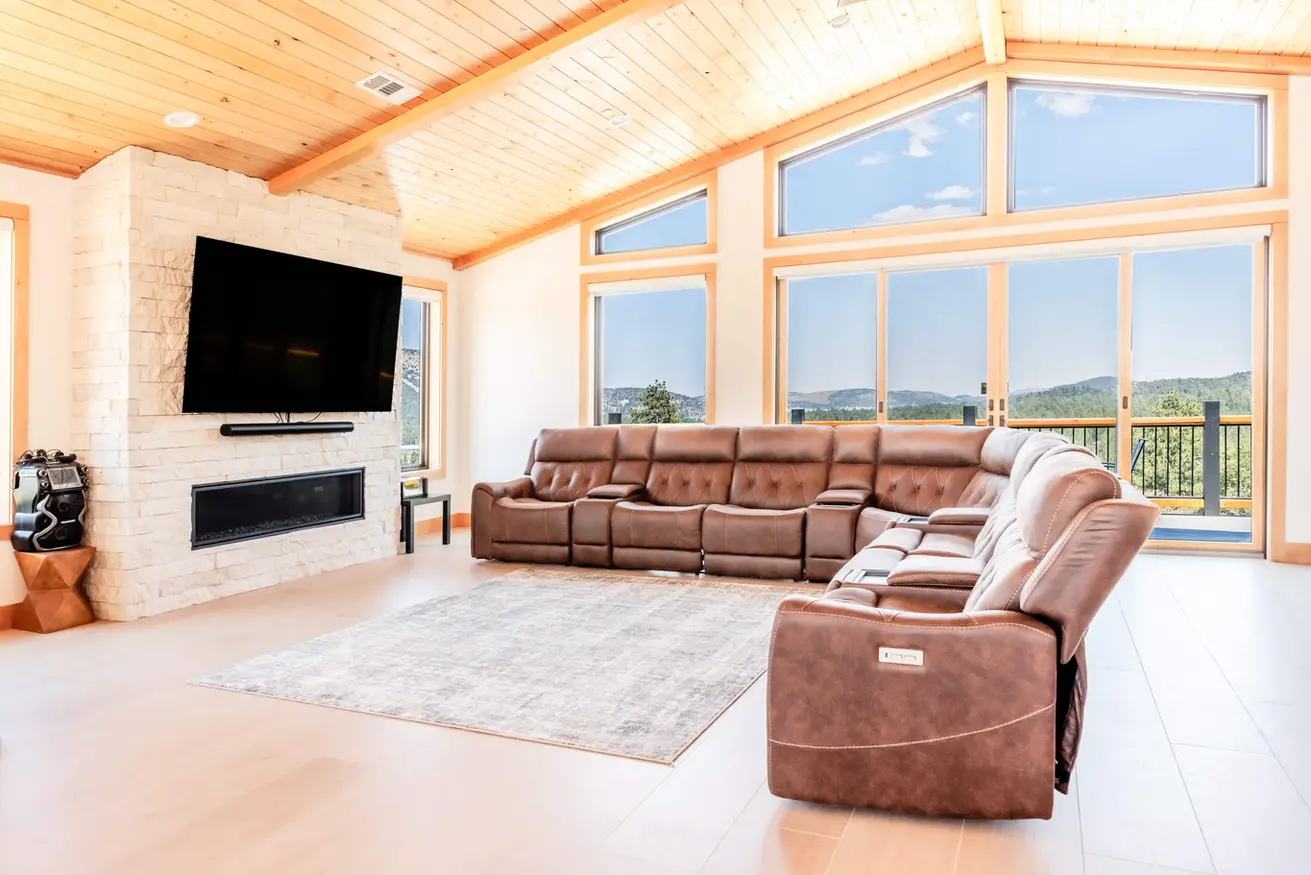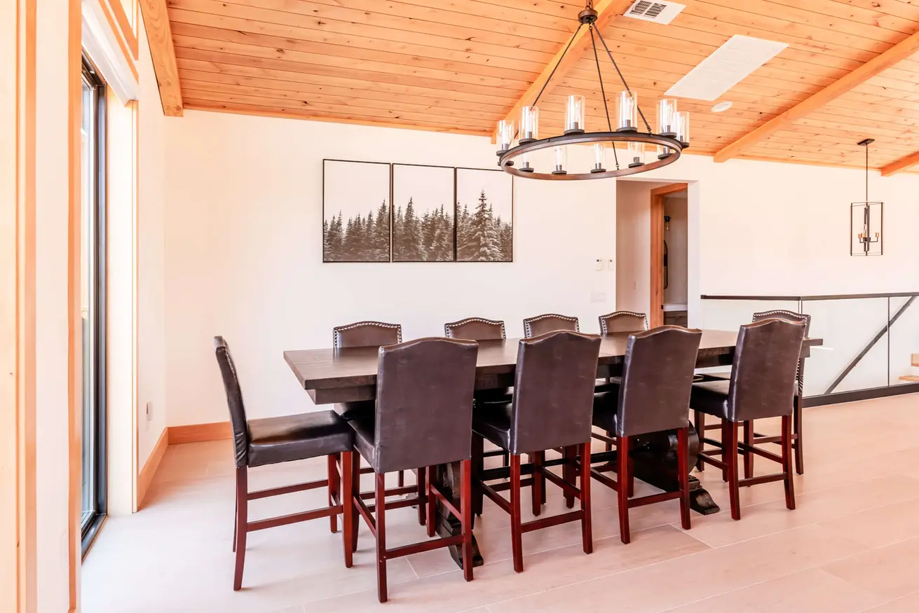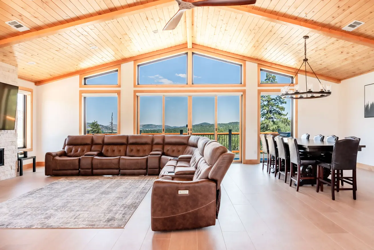 Our open-concept great room upstairs is the heart of the home, perfect for family and friend gatherings. Soaring ceilings and expansive windows frame the stunning mountain backdrop, bringing the beauty of the outdoors inside. Relax on a plush leather sofa by the fireplace, or catch up on movies and shows on the large smart TV. The spacious design allows for plenty of room to unwind, play games, or enjoy the breathtaking views.